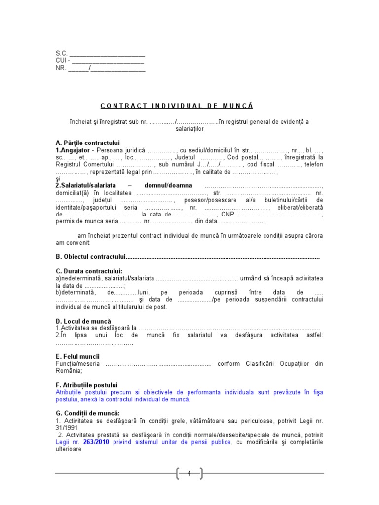 Contract Individual De MuncÄ Model Source from : https://ro.scribd.com/doc/77933056/CONTRACT-INDIVIDUAL-DE-MUNC%C4%82-MODEL Download model de contract individual de munca. Conflictele în legătură cu încheierea, executarea, modificarea, suspendarea sau încetarea. Modelul contractului individual de munca, aprobat prin ordinul ministerului muncii nr. Contractul individual de munca se incheie in baza consimtamantului partilor, in forma scrisa, in limba romana, cel tarziu in ziua anterioara inceperii activitatii de catre salariat, iar obligatia de incheiere a contractului individual de munca in forma scrisa revine angajatorului. Contractul de munca nu seamana cu celelalte contracte.