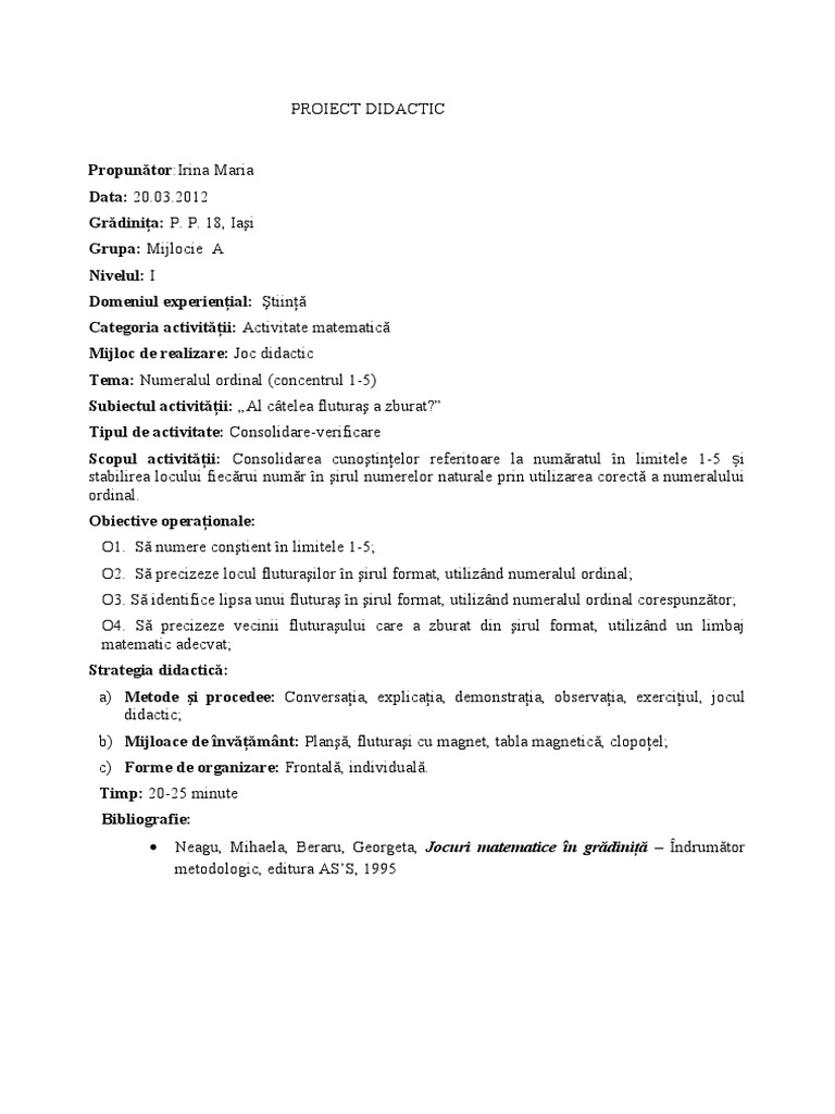 De transmitere si insusire de noi cunostinte. Jocul didactic matematic exercita o influenta deosebita asupra dezvoltarii intelectuale a copiilor, asupra formarii priceperilor (de grupare, comparare, ordonare a multimilor), ajuta la educarea. Prof.mitrea lenuta jocul didactic matematic ii.structura jocului didactic scopul jocului continutul jocului sarcina didactica regulile jocului elementele de joc cuprins i.conceptul de joc didactic scopul jocului reprezintă o finalitate generală spre care tinde jocul. Proiect didactic grupa mijlocie activitate matematica unde sunt mai multe, unde sunt mai putine? 0 din 0 / 0 opinii.