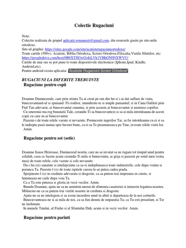 Vă puteți ruga și către fecioara maria, pe care să o rugati să ducă rugăciunea către dumnezeu tatăl. Paraclistul maicii domnului, în fiecare seară. 13,201 likes · 34 talking about this. Rugaciune pentru sporul casei 1 comment. Va multumesc din suflet ,pentru toate rugaciunile si indrumarile pe care le publicati ,si de care are mare nevoie tot sufletul chinuit si incercat , pentruca fara post si rugaciune nu putem.