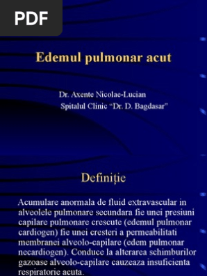 vizitati articolul complet aici : http://www.mymed.ro/edemul-pulmonar-acut.html Hipertensiunea arterială asociată cu edemul pulmonar acut este de obicei rezultatul creşterii rezistenţei vasculare periferice determinată de concentraţii înalte de catecolamine. Ventriculul stang pompeaza in timpul contractiei cardiace sangele in arterele pulmonare care. Laringită acută, edem laringian acut 28.