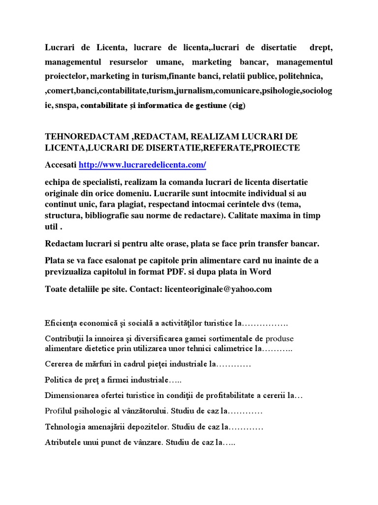 Modele de lucrari de licenta, lucrari de diploma sau studii de caz. Pentru a argumenta răspunsul elevilor li se propune spre realizare (la. Realizam lucrari de licenta la comanda, in cel mai scurt timp, la cel mai bun raport calitate pret.